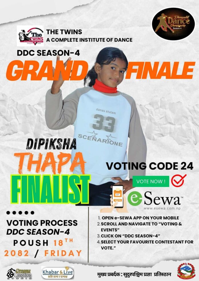 ्सुदूरपश्चिमकै नौ जिल्लाबाट दुई सय जनाको उल्लेख्य सभागितामा रहेको सो डान्स च्याम्पियनसिपमा ११ राउण्ड पार गर्दै दीपिक्षा र आरोहीसहित नौ जना फाइनललिस्टमा पुगेकाछन् । दीपिक्षा र आरोही पुनर्वास नगरपालिका–३ आई.बी.आर.डी.स्थित द फन्की डान्स एण्ड जुम्बाका कोरियोग्राफर सन्तोष अवस्थीद्वारा प्रशिक्षित प्रशिक्षार्थीहरु हुन् । दीपिक्षा र आरोहीलाई इ सेवा एपबाट DDC SEASON_4 दीपिक्षा भोटिङ कोड २४ र आरोही भोटिङ कोड २५ मा यही पौष २५ गतेसम्म भोटिङ गर्न सकिनेछ ।