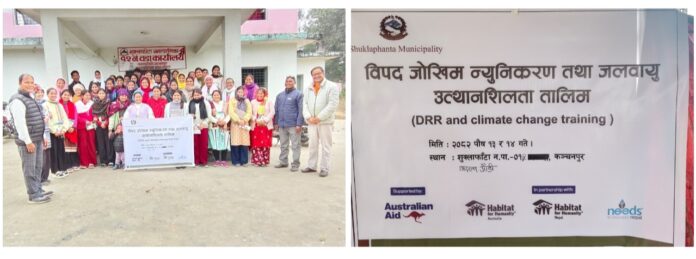 कञ्चनपुर : शुक्लाफाँटा नगरपालिका वडा नं. १२ मा युवाहरूलाई लक्षित गरी विपद् जोखिम न्यूनीकरण तथा जलवायु उत्थानशील समुदाय निर्माण सम्बन्धी दुई दिने तालिम सम्पन्न भएको छ । जलवायु उत्थानशील समुदाय निर्माणका लागि युवाहरूको ज्ञान, सीप र नेतृत्व क्षमता विकास गर्ने उद्देश्यले पुस १३ र १४ गते उक्त तालिम आयोजना गरिएको हो।