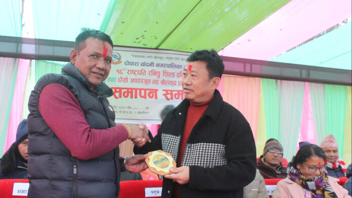 पप्पु गुरुङ्ग, दोधारा । कञ्चनपुरको दोधारा चाँदनी नगरपालिकामा राष्ट्रपति रनिङ्ग शिल्ड छनौट प्रतियोगिता र दोस्रो आधारभुत बिद्यालय स्तरिय प्रतियोगिता सम्पन्न भएको छ् । दोधारा चाँदनी नगरपालिकाको चाँदनी खेलमैदानमा सञ्चालन भएको राष्ट्रपति रनिङ्ग शिल्ड छनौट प्रतियोगिता र दोस्रो आधारभुत बिद्यालय स्तरिय प्रतियोगितामा १२ वटा माध्यमिक तहका बिद्यालय र २१ वटा आधारभुत बिद्यालयहरु सहभागी भएको दोधारा चाँदनी नगरपालिका कार्यालय खेलकुद शाखा कार्यालयका शाखा प्रमुख पदम बहादुर सिंहले बताउनुभएको छ् । बुधवार देखि सञ्चालन भएको प्रतियोगिता आईतवार सम्पन्न भएको खेलकुद शाखाका शाखा प्रमुख पदम बहादुर सिंहले बताउनुभयो ।