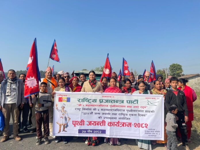 झलारी : राष्ट्रिय प्रजातन्त्र पार्टी (राप्रपा) निर्वाचन क्षेत्र नं. २ क्षेत्रीय कार्यसमिति कञ्चनपुरको आयोजनामा आज कृष्णपुर नगरपालिकामा ३०४ औँ पृथ्वी जयन्ती तथा राष्ट्रिय एकता दिवस भव्य रूपमा मनाइएको छ । क्षेत्रीय सभापति लक्ष्मी चन्दको अध्यक्षतामा सम्पन्न उक्त कार्यक्रममा राप्रपाका केन्द्रीय सह–प्रवक्ता पूर्ण बहादुर चन्द प्रमुख अतिथि रहनुभएको थियो।