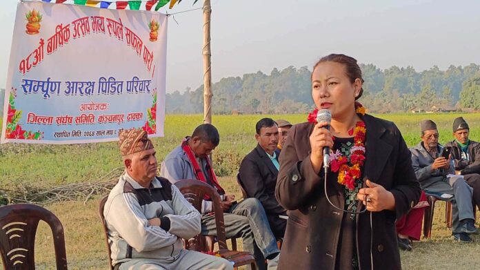 कार्यक्रममा पीडितहरूले आफूहरूको यथोचित व्यवस्थापनका लागि पहल गरिदिन उम्मेदवारहरूसँग माग राखेको समितिका अध्यक्ष मोतीलाल डगौराले जानकारी दिनुभयो । उम्मेदवारहरूले सो विषयमा प्रतिबद्धता व्यक्त गरेका छन् । विगत २४ वर्षदेखि सयौँ आरक्षपीडित परिवारहरू जंगल तथा खोलानाला किनारमा झुपडी बनाएर बस्न बाध्य छन् । आरक्षपीडित संघर्ष समिति कञ्चनपुरका अध्यक्ष मोतीलाल डगौराको अध्यक्षतामा भएको कार्यक्रममा विभिन्न दलका उम्मेदवारदेखि पीडितको उपस्थिति रहेको थियो ।