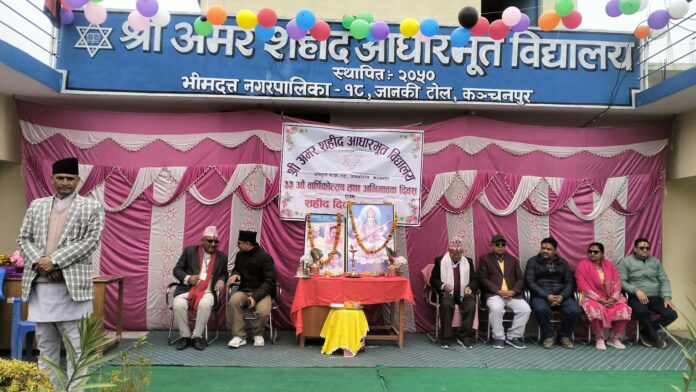 कञ्चनपुर : कञ्चनपुरको भीमदत्त नगरपालिका १८ महेन्द्रनगर जानकी टोलमा रहेको अमर शहीद आधारभूत विद्यालयको बार्षिकोत्सव तथा अभिभावक दिवस सम्पन्न भएको छ । शक्रबार एक कार्यक्रमका विच अमर शहीद आधारभूत विद्यालयको ३३औँ बार्षिकोत्सव तथा अभिभावक दिवस सम्पन्न भएको हो ।