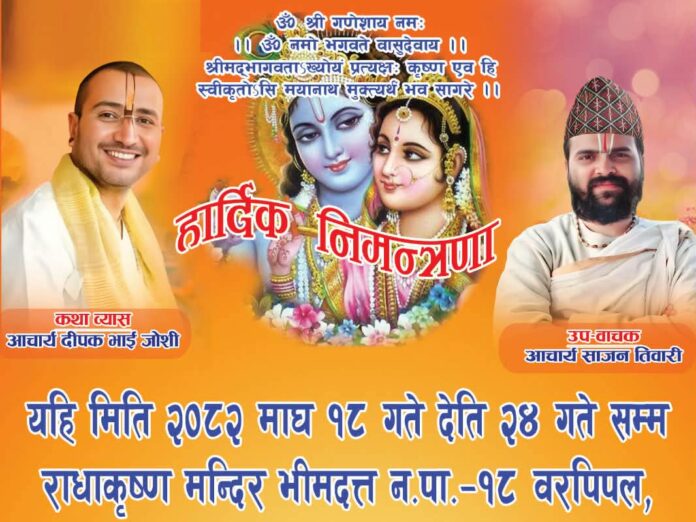 कञ्चनपुरः भीमदत्त नगरपालिका–१८, बरविपलस्थित राधाकृष्ण मन्दिरमा आइतबार देखि श्रीमद्भागवत महापुराण सप्ताह ज्ञान महायज्ञ सञ्चालन हुने भएको छ। राधाकृष्ण मन्दिर प्रबन्ध समिति तथा राधेराधे मातृशक्तिको संयुक्त आयोजनामा महायज्ञ माघ १८ गतेदेखि माघ २४ गतेसम्म सञ्चालन हुनेछ।
