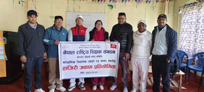 कञ्चनपुर : कञ्चनपुरको दोधाराचाँदनीमा एमाले निकट शिक्षक संगठनको हाजिरीजवाफ प्रतियोगिता भएको छ । नेपाल राष्ट्रिय शिक्षक संगठन कञ्चनपुरका अध्यक्ष उत्तम विष्टले शैक्षिक गुणस्तरका लागि हाजिरीजवाफ प्रतियोगिता भएको बताए । जिल्ला अध्यक्ष विष्टका अनुसार नगर कमिटिले आयोजना गरेको बताए । नेपाल राष्ट्रिय शिक्षक संगठन दोधारा चाँदनी नगर समितिको आयोजनामा माद्यामिक बिधालय ९ कक्षा १० सम्म ० स्तरीय हाजिरी जवाफ प्रतियोगिता मिति २०८२ साल माघ २१ गते दोधारा चाँदनी नगरपालिकाको हल मा सम्पन्न भयो ।