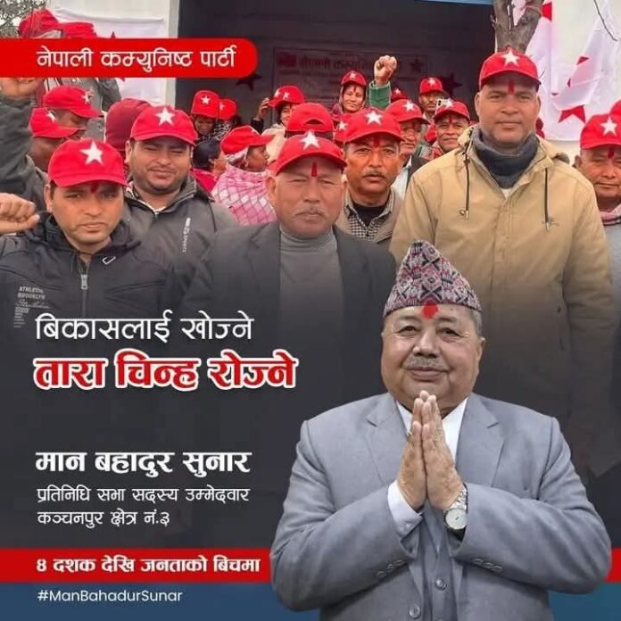 नेपाल कम्युनिष्ट पाटीले दलित समुदायबाट सुनारलाई यस अघि र अहिले पनि राजकीय जिम्मेबारीमा पठाउने निर्णयसंगै क्षेत्र ३का नेकपा नेता कार्यकर्ताहरु फिल्डमा खटिएका छन । नेकपा नेतृ माया नेगीले क्षेत्र ३मा चुनाव प्रचारप्रसारका कामकाज भईरहेको बताईन । उनले चुनावी प्रंचारप्रसारका मुल,देखि विभिन्न उपसमिति र सम्पर्क कार्यालय संचालनमा आएको बताईन । ‘हाम्रा सबै नेता कार्यकर्ताहरुदेखि स्वयम उम्मेदवारकै सर्मथकहरु स्वतस्फूर्त रुपमा खटिएका छन, ‘उनले भनिन, ‘मान बहादुर सुनारकोृ राजनैतिक यात्रा पालिकादेखि प्रदेश हुँदै सिधै केन्द्रीय(सघीय) जिम्मेबारीमा पु¥याउन अहोरात्र खटिएका छन ।’ महाकाली नदी पारीको भूगोलबाट यस अघि पञ्चायतकालमा ईन्द्र बहादुर केसी सांसद थिए, भने बहुदलदेखि गणतान्त्रिक युगसम्म आईपुग्दा उक्त भुगोलबाट सुनार पहिलो पटक सांसदको प्रबल सम्भावना पुग्न लागेको नागरिकको समेत विश्वास रहेको छ । स्थानीयले समेत टिपिकल दोधाराचाँदनीमै गृहनगर भएका सुनार बलिया र साथ सर्मथन दिने आश्वासन दिईरहेका छन । स्थानीय एव नेकपा दोधाराचाँदनीका नेता भरत दत्त भट्टले गणतान्त्रिक युगको सुन्दरफुल भएको बताए । उनले सुनार स्थानीय, प्रदेश सरकारको जिम्मेबारीमा हुँदा समेत सिङ्गो दोधाराचाँदनीदेखि सुप प्रदेशकै विकासका खेलेको भूमिकाले समेत उनको नागरिकमा मुल्याङकन भईरहेको बताए ।