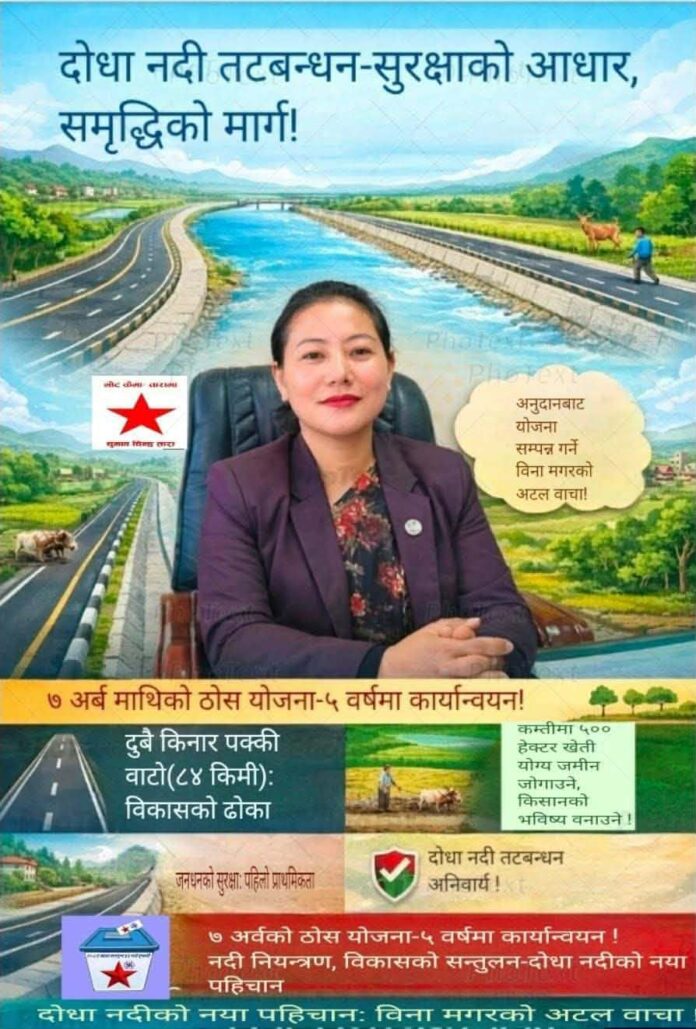 , वर्षौँदेखि दोदा नदीको बाढीले हाम्रो पसिना, हाम्रो मेहनत, हाम्रो भविष्य बगाइरहेको छ। हरेक वर्ष डर, त्रास र क्षतिबाट गुज्रिनुपर्ने अवस्था अब सह्य छैन। अब केवल आश्वासन होइन ठोस कार्यान्वयन चाहिन्छ! दोदा नदी तटबन्धन कुनै सपना होइन, यो हाम्रो अधिकार हो। ७ अर्बको ठोस योजना, ५ वर्षभित्र कार्यान्वयन गर्ने स्पष्ट रोडम्यापका साथ नेत्री बिना मगर अगाडि बढनु भएको छ । दुबै किनारमा ८४ किलोमिटर पक्की बाटो निर्माण हुनेछ जसले सुरक्षा मात्र होइन, विकासको ढोका खोल्नेछ। कम्तीमा ५०० हेक्टर खेतीयोग्य जमिन जोगिनेछ, किसानको भविष्य सुरक्षित हुनेछ। हामी निर्माण गर्ने पुस्ता हौँ। जनताको सुरक्षा पहिलो प्राथमिकता हो। समृद्ध कञ्चनपुर हाम्रो लक्ष्य हो।दोदा नदीको नयाँ पहिचान सुरक्षित बस्ती, सशक्त किसान, र द्रुत विकास! । अब निर्णय तपाईंको हातमा छ। बहाना गर्ने कि निर्माण गर्ने ? डरमा बाँच्ने कि समृद्ध भविष्य रोज्ने? , आउनुहोस्, एकजुट भएर दोदा नदीलाई नियन्त्रणमा ल्याऔँ र कञ्चनपुरलाई विकासको नयाँ युगमा प्रवेश गराऔँ! यसको निम्ति तारा चुनाब चिन्ह मा मतदान गरेर बिना मगरलाई जिताऔ ।भन्दै मत माग्दै हिडेका छन । यसरी एमालेकै युवा विद्यार्थी नेता महिला नेतृ बीना मगरका लागि मत माग्दै हिडेपछि अन्य आम मतदाता बीना मगरप्रति थप विश्वस्त भईरहेका छन ।