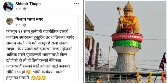 कञ्चनपुर : राष्ट्रिय प्रजातन्त्र पाटी(राप्रपा)ले मंगलबार (फागुन ५)गते दिउँसो २ बजेतिर भीमदत्त नगरपालिका ५ महेन्द्रनगर महेन्द्र स्मारक चोकमा चुनावी सभा गर्दै छ । तर, दोस्रो जनआन्दोलनबाट निरङकुश राजतन्त्रै २० बर्ष अघि तोडिएको राजा महेन्द्रको सालिक पुर्नस्थापना भएको छ । ईतिहासको रक्षा भन्दै महेन्द्रनगरका युवा समाजसेवी शिशिर थापा, सञ्जिवचन्द्र भट्ट, धनी चन्द, मिलाप थापा सहितका युवाहरुको अगुवाईमा महाशिवरात्रीका दिन सालिक स्थापना गरिएको थियो । सालिक पुर्नस्थापना गरेका युवाहरुले राजाको सालिक पुर्नस्थापना भएको तीन दिनमै चुनावी कार्यक्रम गरेर राजनीति गर्न खोजको भन्दै बिरोधमा उत्रिएका छन ।