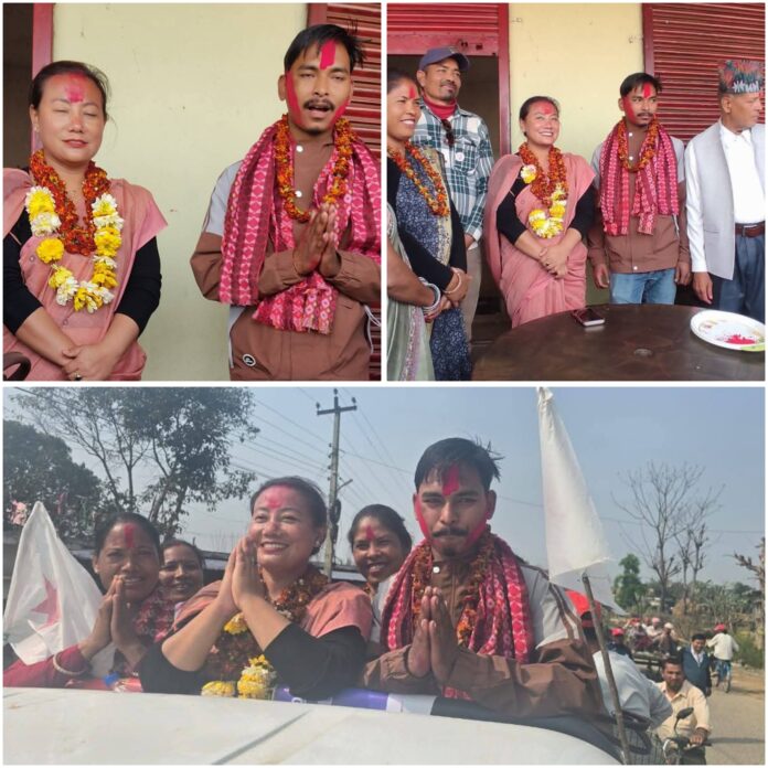 आफ्नो उम्मेदवारी समेत तिलान्जली दिदै चुनावी मैदान छाडेर नेकपा उम्मेदवार बीना मगर जिताउने अभियानमा जुटेका उम्मेदवारद्वय देपेन्द्र बहादुर शाही र सियाराम रानाले युद्धस्तरमा महिला नेतृ बीना मगर जिताउने सकल्प गरेकी छिन ।