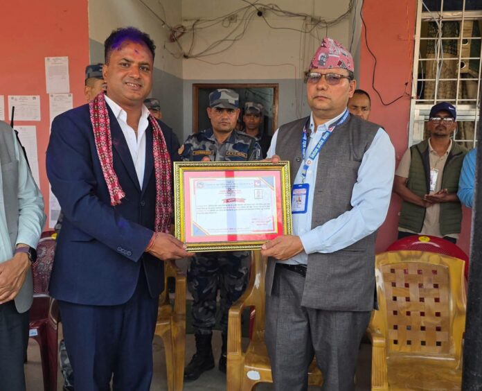 निर्वाचन अधिकृत प्रकाश भण्डारीले निर्वाचित उम्मेदवारलाई प्रमाणपत्र वितरण गरिएको जानकारी दिए।