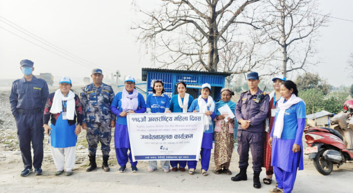 दोधारा । माईती नेपाल कञ्चनपुरले ११६ औं अन्तर्राष्ट्रिय महिला दिवसको अवसरमा ‘सबै महिला र बालिकाको लागि अधिकार, न्याय र कार्य सहितको अवसर’ भन्ने मुल नाराका साथ समुदायमा सचेतना अभिवृद्धि गर्ने उद्धेश्यले कञ्चनपुरको दोधारा चाँदनी नगरपालिका वडा नंं. १, स्याउली बजार क्षेत्रमा घरधुरीमा घरदैलो कार्यक्रम सम्पन्न गरेको छ् । दोधारा चाँदनी नगरपालिका वडा नंं. १ खुला सीमा नाका भएको हुदां लुकीछिपि महिला तथा बालबालिकाहरुलाई भारत प्रवेश गराउन सहज भएको हुने हुदा मानव बेचबिखन तथा ओसारपसारलाई न्युनिकरण गर्न स्थानियबासीहरु जागरुक गराउन घरदैलो कार्यक्रम सम्पन्न गरेको माईती नेपाल कञ्चनपुरका संयोजक महेश्वरी भट्टले बताउनुभएको छ् ।