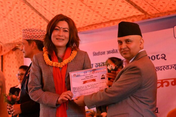 काठमाडौँ । राष्ट्रिय स्वतन्त्र पार्टी (रास्वपा) की भुमिका श्रेष्ठ प्रतिनिधि सभा सदस्य (समानुपातिक) का रूपमा निर्वाचित भई निर्वाचन आयोगबाट प्रमाणपत्र ग्रहण गर्नुभएको छ। प्रमाणपत्र ग्रहण पश्चात उहाँले अत्यन्त गर्व र खुशी महसुस गरेको बताउनुभएको छ।