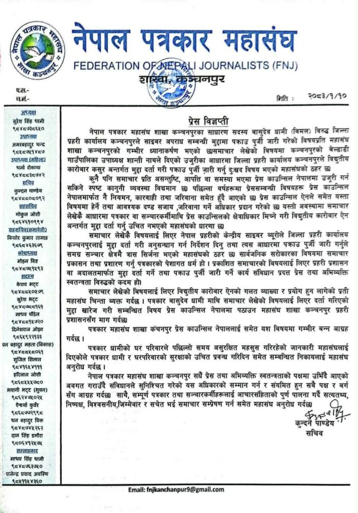 समाचार लेखेकै विषयलाई लिएर नेपाल प्रहरीको केन्द्रीय साइबर ब्यूरोले जिल्ला प्रहरी कार्यालय कञ्चनपुरलाई मुद्दा दर्ता गरी अनुसन्धान गर्न निर्देशन दिनु तथा त्यस आधारमा पक्राउ पुर्जी जारी गर्नुले समग्र सञ्चार क्षेत्रमै त्रास सिर्जना भएको महासंघको ठहर छ । सार्वजनिक सरोकारका विषयमा समाचार प्रकासन तथा प्रशारण गर्नु पत्रकारको पेशागत धर्म हो । प्रकाशित समाचारको बिषयलाई लिएर प्रहरी प्रशासन वा अदालतमार्फत मुद्दा दर्ता गर्ने तथा पक्राउ पुर्जी जारी गर्ने कार्य संविधान प्रदत्त प्रेस तथा अभिव्यक्ति स्वतन्त्रता विरुद्धको कदम भएको भन्दै महासंघले आपत्ति जनाएको छ । समाचार लेखेको बिषयलाई लिएर विद्युतीय कारोबार ऐनको गलत व्याख्या र प्रयोग हुन लागेकोप्रती पत्रकार महासंघले चिन्ता व्यक्त गरेको छ । पत्रकार धामी माथि समाचार लेखेको विषयलाई लिएर दर्ता गरिएको मुद्दा खारेज गरी सम्बन्धित विषय प्रेस काउन्सिल नेपालमा पठाउन महासंघले कञ्चनपुर प्रहरी प्रशासनसँग माग गरेको छ ।