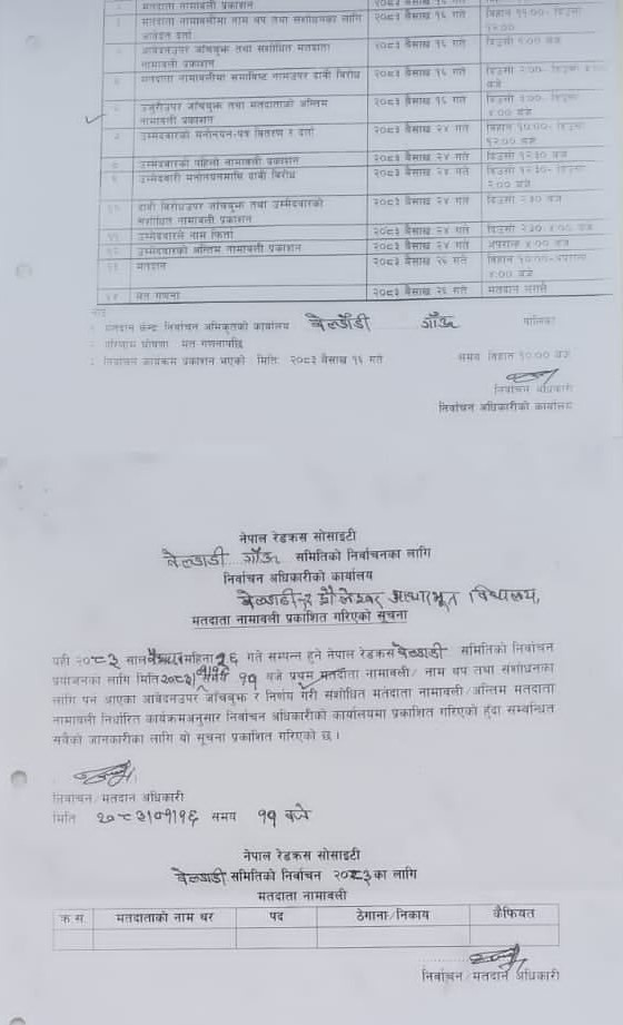 नेपाल रेडक्रस सोसाईटी निर्वाचन अधिकृत अधिवक्ता निरन्जन प्रशाद विष्टले निर्वाचन कार्यतालिका सहित मतदाता नामावली नामावली प्रकासन भएको बताए । उनका अनुसार ६१८मतदाता रहेको बेलडाँडीमा रेडक्रसको नयाँ कार्य समिति चयनका लागि तयारी भईरहेको छ । बेलडाँडी सहित बेलौरी, पुनर्वास, लालझाडी, कृष्णपुर, शुक्लाफाँटा, बेदकोट, भीमदत्त, र दोधाराचाँदनीमा एकसाथ हुने जनाईएको छ ।